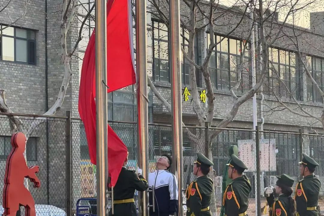 清晨的运动场上,学生们排列成行,面向国旗肃立。随着国歌的响起,鲜艳的五星红旗冉冉升起,学生们神情庄重,心中充满敬意。