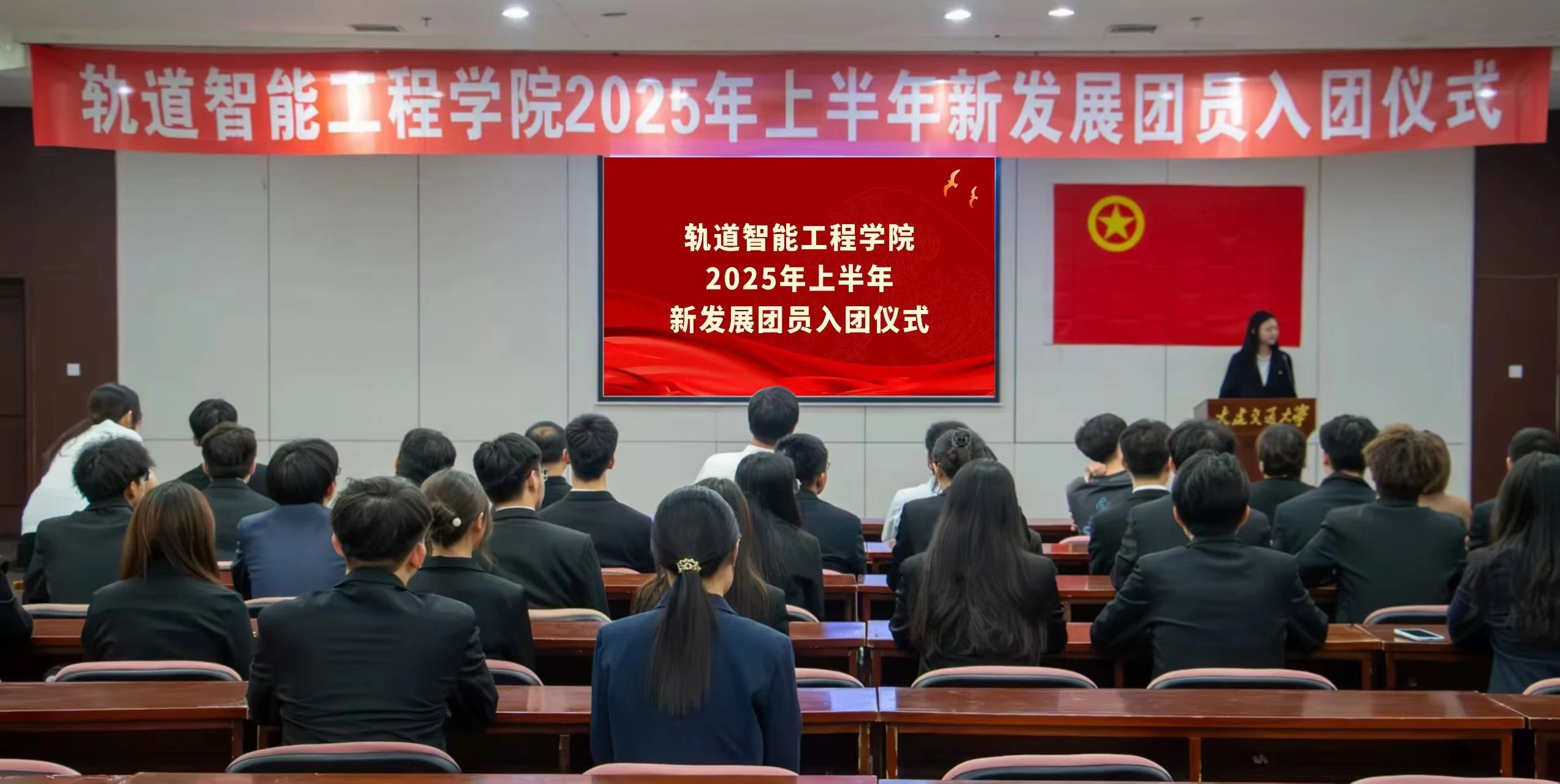 于6月30日在旅顺口校区图书馆报告厅举行了2025年上半年新发展团员入团仪式。学院党委书记陈少华、团委书记郑凯文、辅导员老师、优秀团员代表以及新发展团员共同出席了此次仪式,仪式由学院团委团学部李欣璐主持。