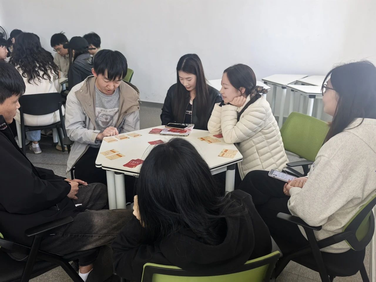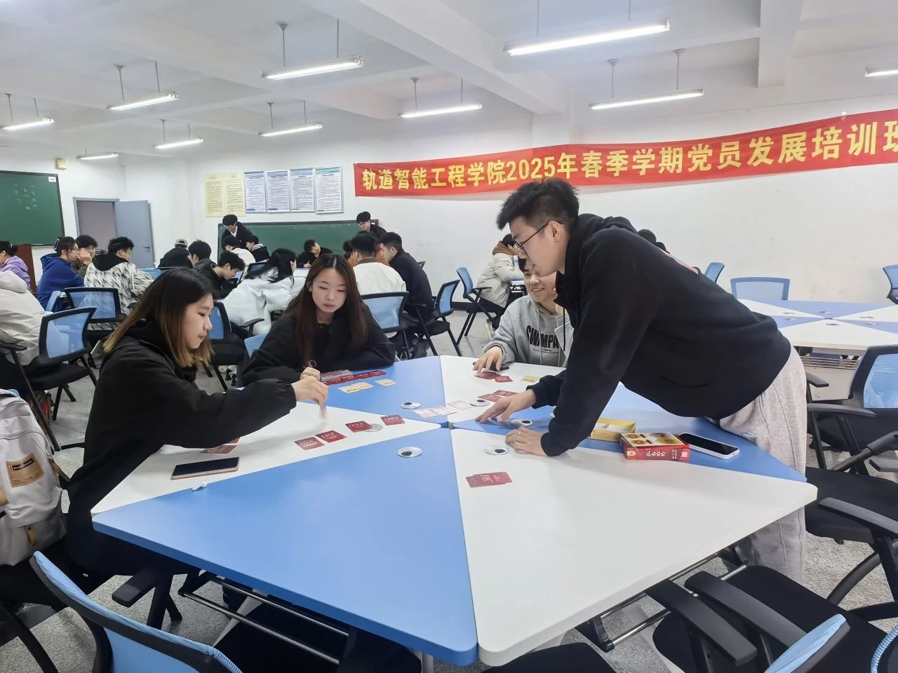 在志愿者的精心引导下,紧张刺激的桌游环节有序展开。多个重要历史事件的画面在学员们的脑海中渐渐清晰,一条伟大的历史长河随着游戏的进程缓缓铺开在学员面前。游戏内容丰富多彩,充分考验了学员们对百年党史的掌握程度。