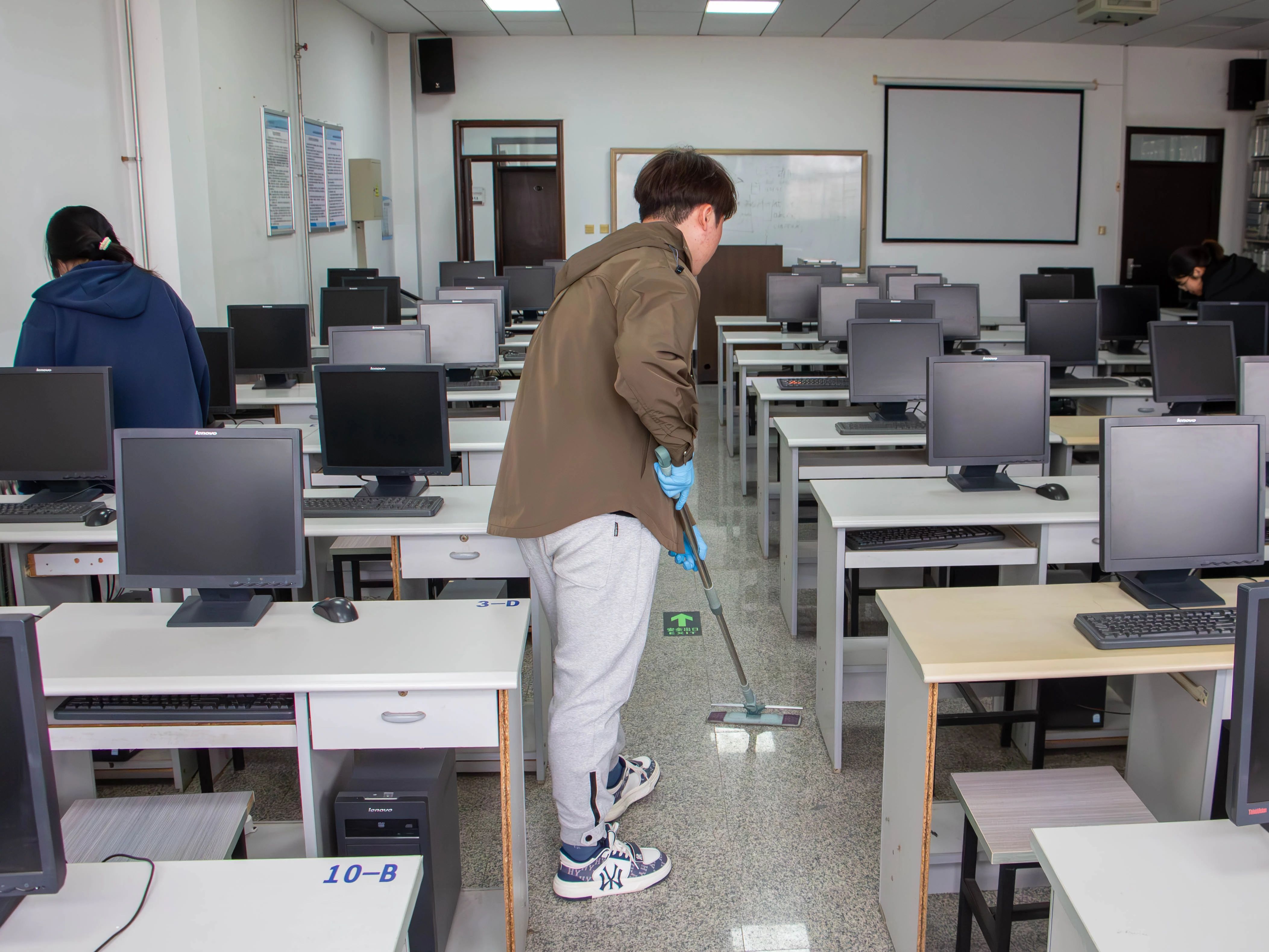 活动中,学员分工协作,有人细致擦拭电脑设备,有人清理地面杂物。大家不惧脏累,专注清洁每个角落。经过努力,公共机房设备洁净、地面整洁,面貌焕然一新。