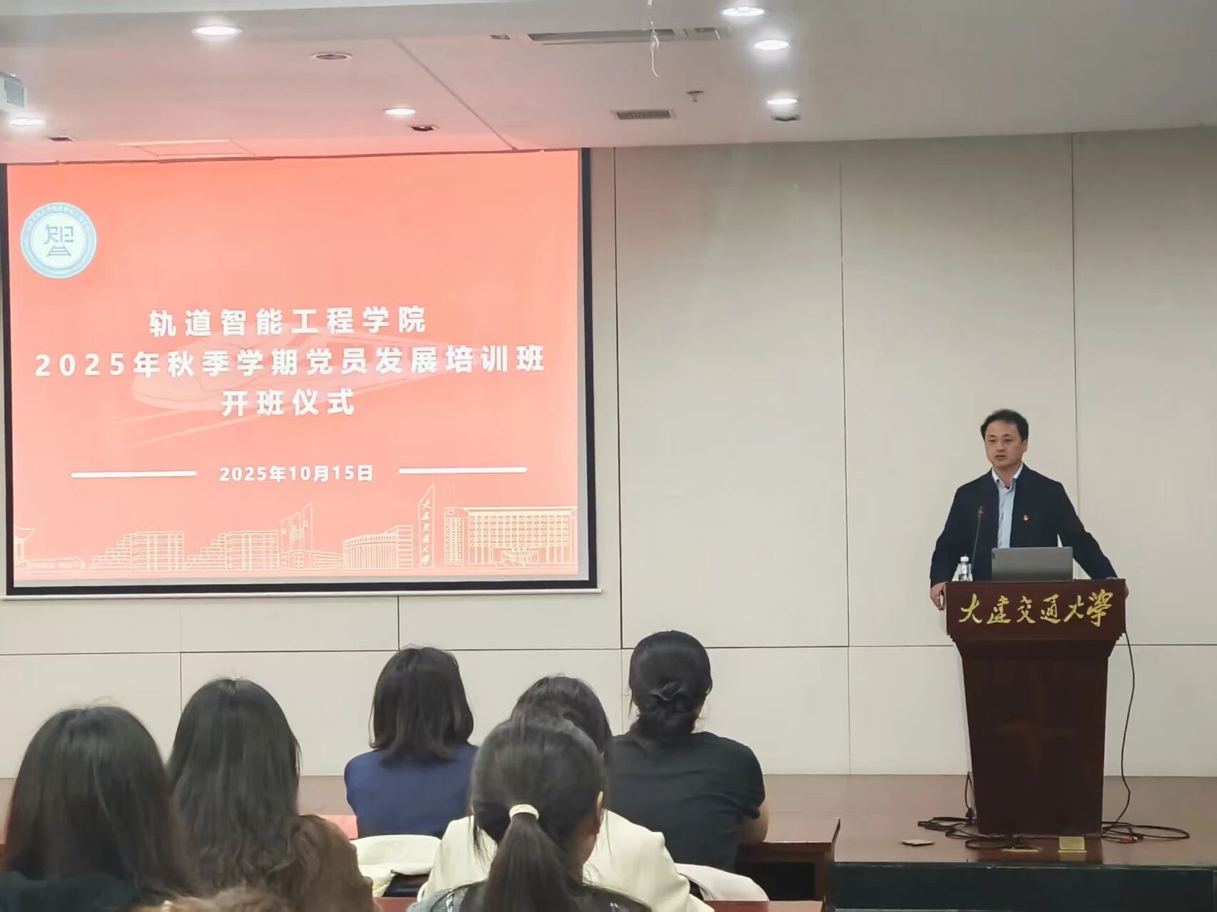 在旅顺口校区图书馆报告厅举行2025年秋季学期党员发展培训班开班仪式,学院党委书记陈少华、党委副书记邓晗、组织员张程远出席仪式,开班仪式由组织员赵金蕾主持。