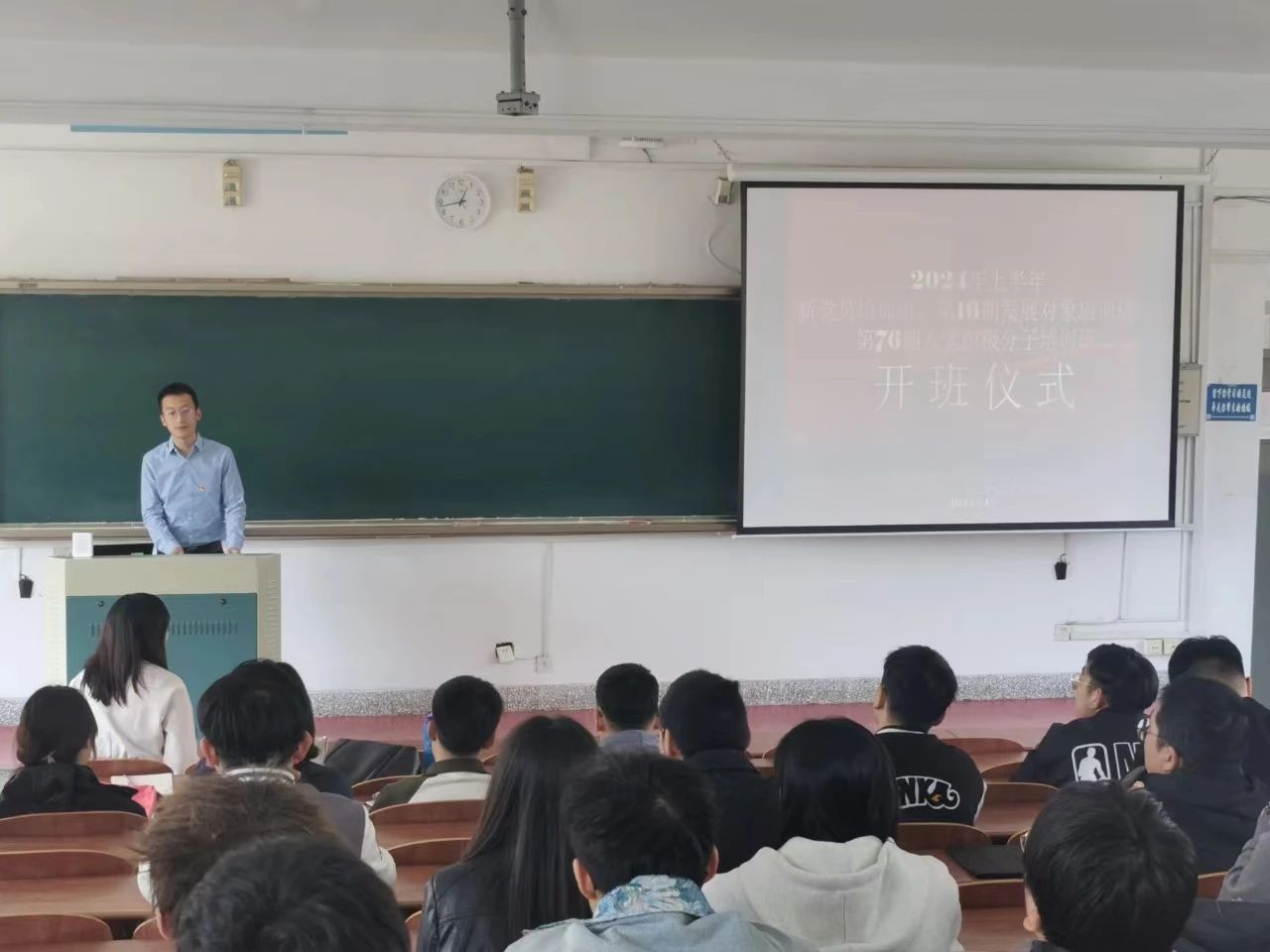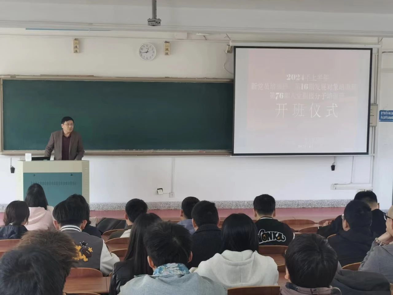 在本部2号楼305教室举行2024年上半年新党员培训班、第16期发展对象培训班、第76期入党积极分子培训班开班仪式。本次开班仪式由学生党支部书记王衍主持,学院党总支书记姜来金和全体新党员、发展对象、入党积极分子共同参加。